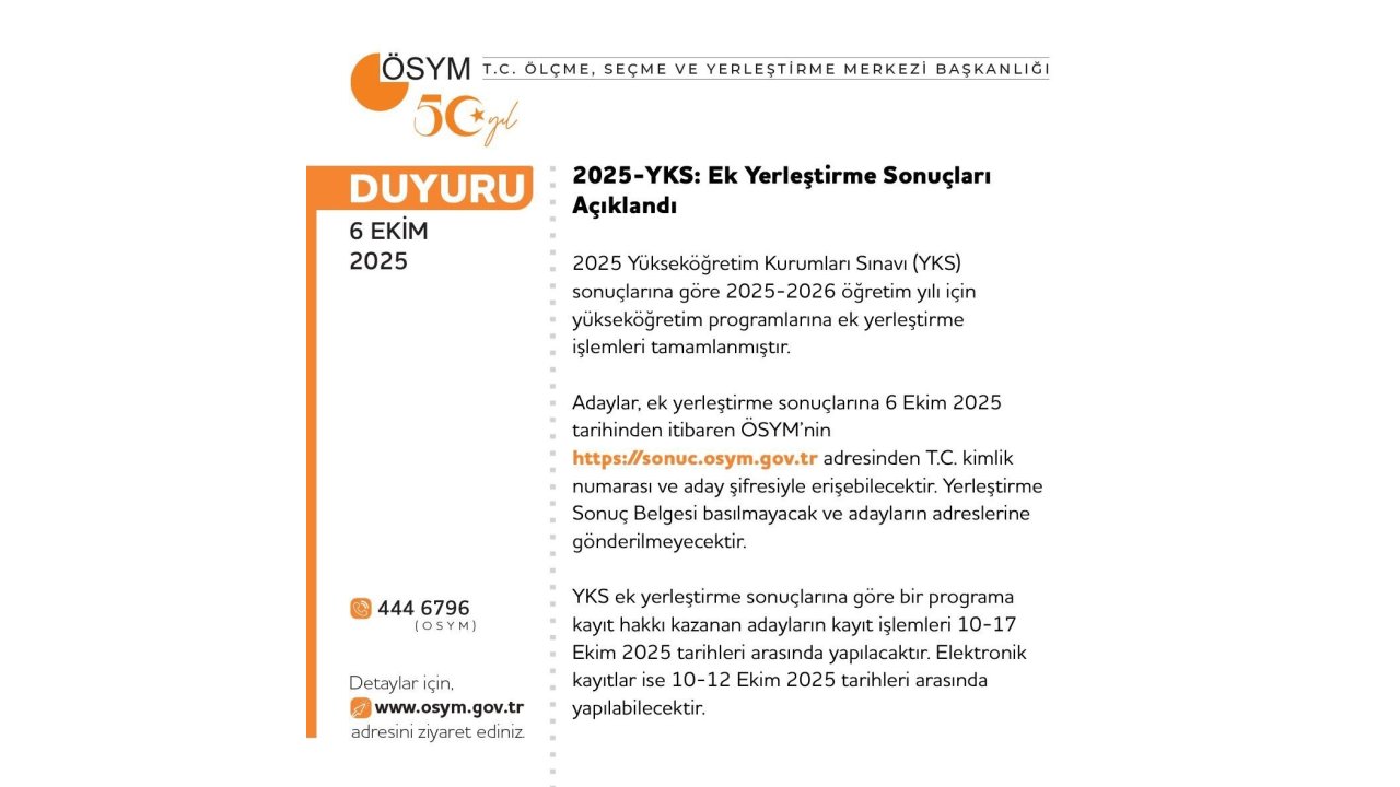 2025 Yükseköğretim Kurumları Sınavı (YKS) sonuçlarına göre 2025-2026 öğretim yılı için yükseköğretim programlarına ek yerleştirme sonuçları, Yükseköğretim Kurulu (YÖK) tarafından açıklandı.2025 YKS ek yerleştirme sonuçları, Öğrenci Seçme ve Yerleştirme Merkezi (ÖSYM) sitesinde açıklandı. Adayların, ek yerleştirme sonuçlarına 6 Ekim 2025 tarihinde saat 16.30'dan itibaren ÖSYM'nin resmi sitesinden T.C. kimlik numarası ve aday şifresiyle erişebilecekleri belirtildi.ÖSYM'nin sosyal hesabından yapılan paylaşımda şu ifadeler yer verildi:"2025 Yükseköğretim Kurumları Sınavı (YKS) sonuçlarına göre 2025-2026 öğretim yılı için yükseköğretim programlarına ek yerleştirme işlemleri tamamlanmıştır. Adaylar, ek yerleştirme sonuçlarına 6 Ekim 2025 tarihinde saat 16.30'dan itibaren ÖSYM'nin https://sonuc.osym.gov.tr adresinden T.C. kimlik numarası ve aday şifresiyle erişebilecektir. Yerleştirme Sonuç Belgesi basılmayacak ve adayların adreslerine gönderilmeyecektir. YKS ek yerleştirme sonuçlarına göre bir programa kayıt hakkı kazanan adayların kayıt işlemleri 10-17 Ekim 2025 tarihleri arasında yapılacaktır. Elektronik kayıtlar ise 10-12 Ekim 2025 tarihleri arasında yapılabilecektir. Kayıt için adayların yerleştirildikleri yükseköğretim programının bağlı bulunduğu üniversiteye süresi içinde başvurmaları gerekmektedir. Elektronik kayıt yapan adaylar, üniversiteleri tarafından duyurulan tarihe ve ilgili belgelere göre işlem yapacaktır. Ek yerleştirme sonuçlarına ilişkin sayısal bilgiler Ek'te sunulmuştur."