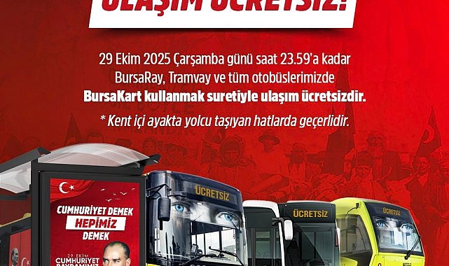 Bursa Büyükşehir Belediyesi, özgürlüğün, bağımsızlığın ve Cumhuriyetin ilanının 102. yıl dönümünü coşkuyla kutluyor. Bu çerçevede, BursaRay, tramvay ve otobüs hatları 29 Ekim Çarşamba günü ücretsiz olarak hizmet verecek.Bursa Büyükşehir Belediyesi tarafından yapılan açıklamada şu cümlelere yer verildi;"Kent içinde ayakta yolcu taşıyan BursaRay, tramvay ve otobüs hatlarımız, 29 Ekim 2025 Çarşamba günü saat 23.59'a kadar, BursaKart kullanmak suretiyle ücretsiz olarak hizmet verecektir. Bayramımızı hep birlikte coşkuyla, onurla ve gururla kutlayalım."