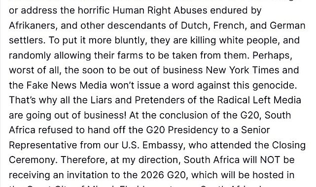 ABD Başkanı Donald Trump, Güney Afrika'nın G20 Zirvesi'nin sonunda yapılan kapanış töreninde ABD Büyükelçiliği'nin kıdemli temsilcisine G20 dönem başkanlığını devretmeyi reddettiğini belirterek, "Bu nedenle Güney Afrika benim talimatımla gelecek yıl Florida'nın Miami kentinde düzenlenecek olan 2026 G20 Zirvesi'ne davet edilmeyecektir" açıklamasında bulundu. Trump, Güney Afrika'ya yapılan tüm ödemelerin ve yardımların derhal durdurulacağını