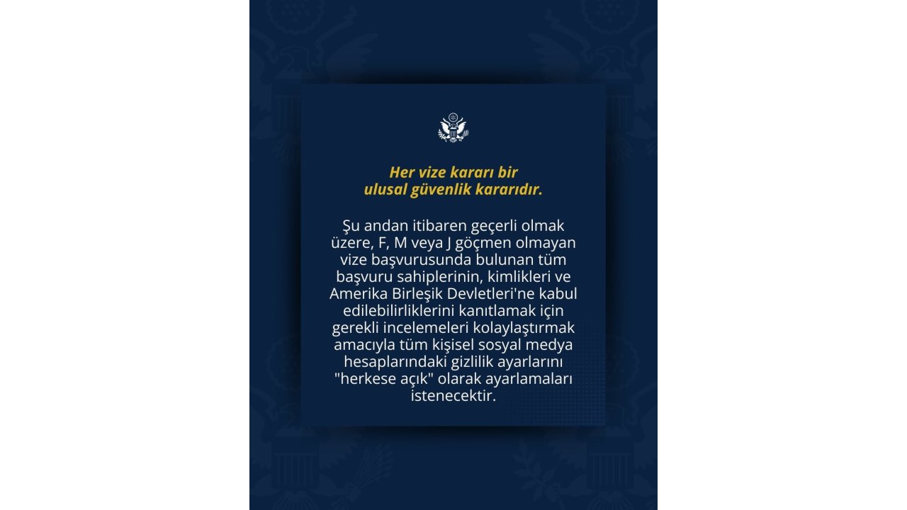 Amerika Birleşik Devletleri'nin (ABD) Ankara Büyükelçiliği, vize başvurularında gerekli incelemelerde tüm kişisel sosyal medya hesaplarındaki gizlilik ayarlarının "herkese açık" olması şartı getirildiğini duyurdu.ABD Ankara Büyükelçiliği'nin sosyal medya hesabından, "Her vize kararı bir ulusal güvenlik kararıdır" notuyla paylaştığı duyuruda, vize başvurularında kişilerin sosyal medya hesaplarının "herkese açık" olması zorunluluğunun geldiği bildirildi. Büyükelçilik tarafından yapılan açıklamada, şu ifadeler yer aldı:"Şu andan itibaren geçerli olmak üzere, F, M veya J göçmen olmayan vize başvurusunda bulunan tüm başvuru sahiplerinin, kimlikleri ve Amerika Birleşik Devletleri'ne kabul edilebilirliklerini kanıtlamak için gerekli incelemeleri kolaylaştırmak amacıyla tüm kişisel sosyal medya hesaplarındaki gizlilik ayarlarını "herkese açık" olarak ayarlamaları istenecektir."