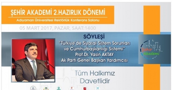 Şehir Akademi 2.Hazırlık Dönemi, 5 Mart’ta Adıyaman Üniversitesi Rektörlük Konferans Salonunda AK Parti Genel Başkan Yardımcısı Prof. Dr Yasin Aktay’ın konuk olacağı, “Türkiye’de siyasal sistem sorunları ve cumhurbaşkanlığı sistemi”...