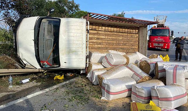 Antalya'nın Serik ilçesinde saman yüklü kamyonetin devrilmesi sonucu samanlar yola savruldu.