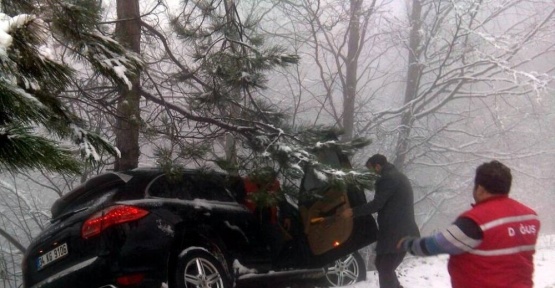 Bursa’da, Uludağ yolunda kar sebebiyle kayan lüks jeep, uçurumun kenarında bulunan ağaçlara çarparak durabildi. Araç sürücüsü kazayı hafif sıyrıklarla atlattı.