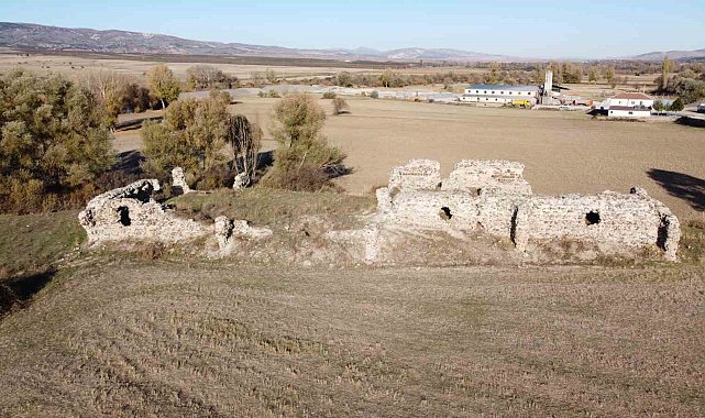 Yozgat'ın Saraykent ilçesine bağlı Kadışehri yolu üzerinde, Örencik ile Kesikköprü köylerinin kesiştiği noktada bulunan ve halk arasında 'Kesikköprü Kervansarayı' olarak bilinen tarihi yapı, dron kamerasıyla kaydedildi.