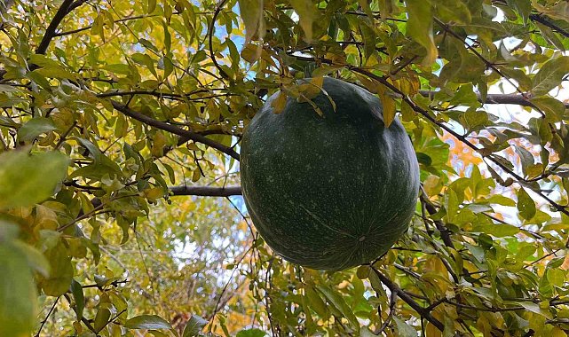 Bahçeye ektiği kabak, nar ağacının tepesinde meyve verdi