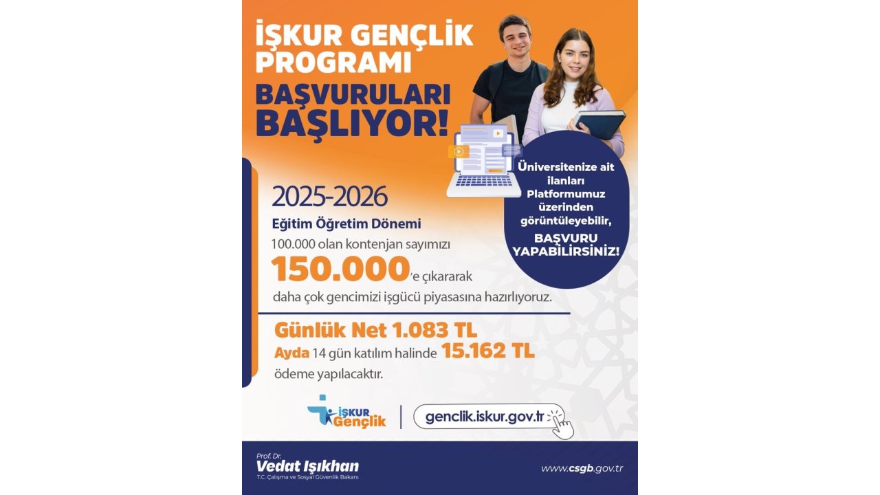 Çalışma ve Sosyal Güvenlik Bakanı Vedat Işıkhan, "İŞKUR Gençlik Programımıza başvurular başlıyor. Ay içerisinde 14 günün tamamlanması halinde uygulanacak program ile aylık 15 bin 162 lira gelir desteği elde edebileceksiniz" dedi.Bakan Işıkhan, sosyal medya hesabından üniversite okuyan öğrenciler için İŞKUR Gençlik Programı başvurularının başladığını duyurdu. Öğrencilerin kendi kampüslerinde deneyim elde edebileceklerini belirten Işıkhan, haftada 3 gün, ay içerisinde ise 14 günün tamamlanması halinde program kapsamında öğrencilere aylık 15 bin 162 lira gelir desteği elde edebileceklerini açıkladı. Aynı zamanda Işıkhan, 100 bin olan kontenjanın da 150 bine çıkarıldığını bildirdi."İŞKUR Gençlik Programımıza başvurular başlıyor"Bakan Işıkhan, yaptığı paylaşımda şu ifadelere yer verdi:"Üniversite okuyan kıymetli gençlerimiz, sizlere güzel bir haberimiz var. İŞKUR Gençlik Programımıza başvurular başlıyor. Kendi kampüslerinizde hem mesleki deneyim kazanacak hem de derslerinizi aksatmayacak şekilde haftada 3 güne kadar, ay içerisinde 14 günün tamamlanması halinde uygulanacak program ile aylık 15 bin 162 lira gelir desteği elde edebileceksiniz. Tekrar hatırlatalım; taleplerinizi dinledik, kontenjanımızı 100 binden 150 bine çıkardık."Işıkhan ayrıca programın detaylarını üniversitelerden ve "genclik.iskur.gov.tr" internet adresinden öğrenilebileceğini belirtti.