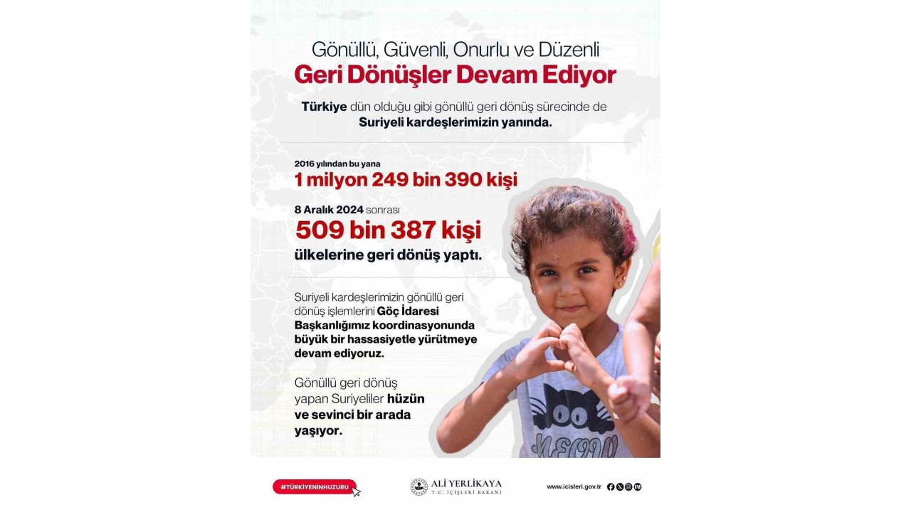 İçişleri Bakanı Ali Yerlikaya, "8 Aralık 2024 tarihi sonrasında toplam 509 bin 387 Suriyeli kardeşimiz ülkelerine geri dönüş yaptı. 2016 yılından bu yana gönüllü geri dönüş yapan Suriyelilerin sayısı 1 milyon 249 bin 390 kişiye ulaştı"...
