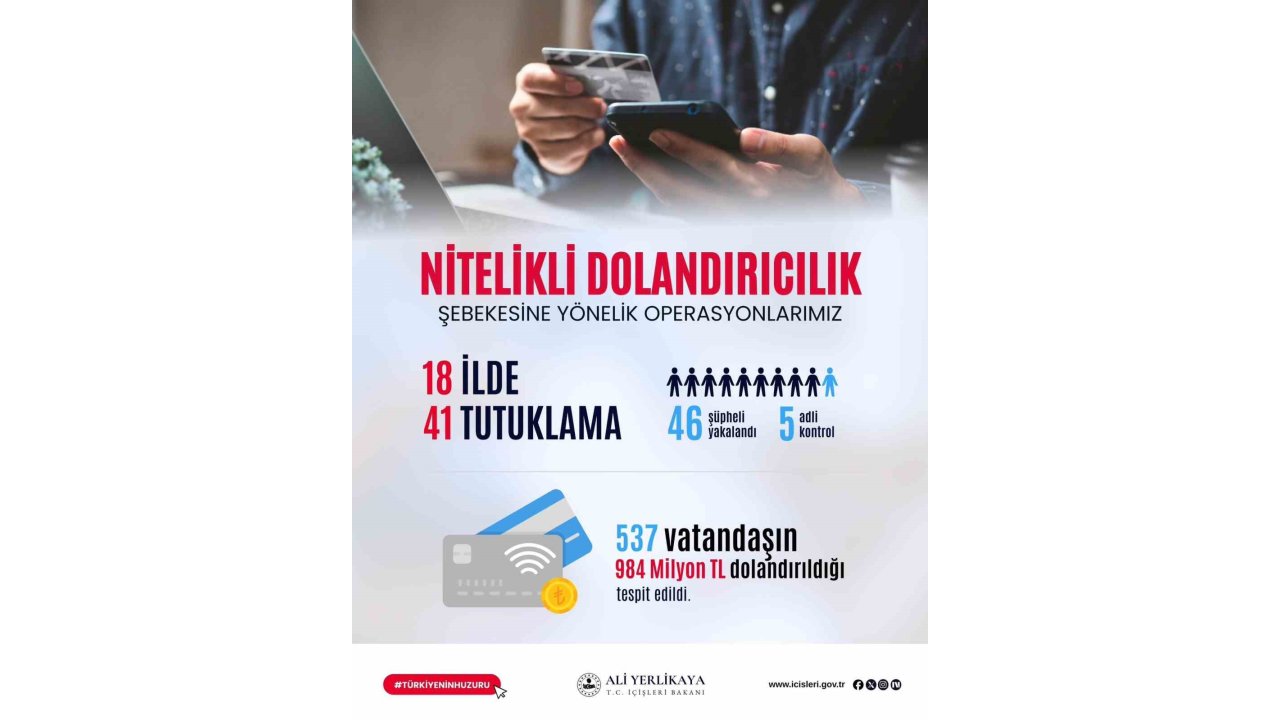 İçişleri Bakanı Ali Yerlikaya, "537 vatandaşımızı, 984 milyon lira dolandıran şebeke çökertildi" dedi.İçişleri Bakanı Yerlikaya sosyal medya hesabından yaptığı paylaşımda, Tekirdağ merkezli 18 ilde "Nitelikli Dolandırıcılık Şebekesine" yönelik düzenlenen operasyonlarda; 46 şüphelinin yakaladığını 41'inin ise tutuklandığını belirterek, şu ifadelere yer verdi:"5'i hakkında adli kontrol hükümleri uygulandı. Yüksek kar vaadiyle paravan şirketler kurarak vatandaşlarımızı dolandırdıkları ve banka hesaplarında 5 milyar lira işlem hacmi bulunduğu tespit edilen şüphelilere yönelik Tekirdağ merkezli İstanbul, Gaziantep, Hatay, Manisa, Adana, Antalya, Diyarbakır, Karaman, Mersin, Kırklareli, Osmaniye, Sakarya, Aydın, Yalova, İzmir, Kocaeli ve Muğla'da operasyonlar düzenlendi. 537 vatandaşımızı, 984 milyon lira dolandıran şebeke çökertildi. Valilerimizi, Cumhuriyet Başsavcılıklarımızı, EGM Asayiş Daire Başkanlığımızı, Tekirdağ İl Emniyet Müdürümüzü, Asayiş Şube Müdürlüğümüzü ve kahraman polislerimizi tebrik ediyorum. Milletimizin alın terine göz diken dolandırıcılara geçit yok. Mücadelemize aralıksız devam ediyoruz."