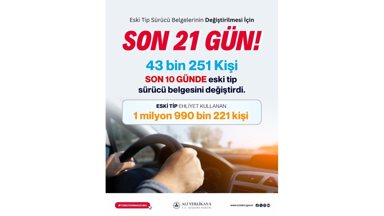 İçişleri Bakanı Ali Yerlikaya, "Son 21 gün, süre uzatılmayacak. Ekim ayı içinde sadece 43 bin 251 vatandaşımız eski tip sürücü belgesini yeniledi" dedi.