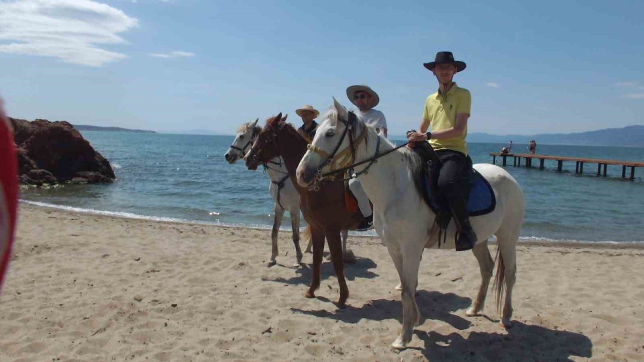 Burhaniye ilçesinde, deniz sezonu açılırken, sahile gelen 3 gencin Ören plajında sürdüğü atlar ilgi odağı oldu.