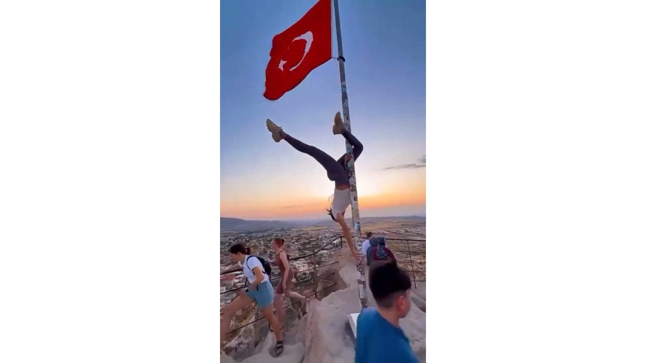 Kapadokya'da yabancı uyruklu bir turistin Türk bayrağı direğinde yaptığı uygunsuz hareketler kamuoyunda büyük tepkiye yol açtı.