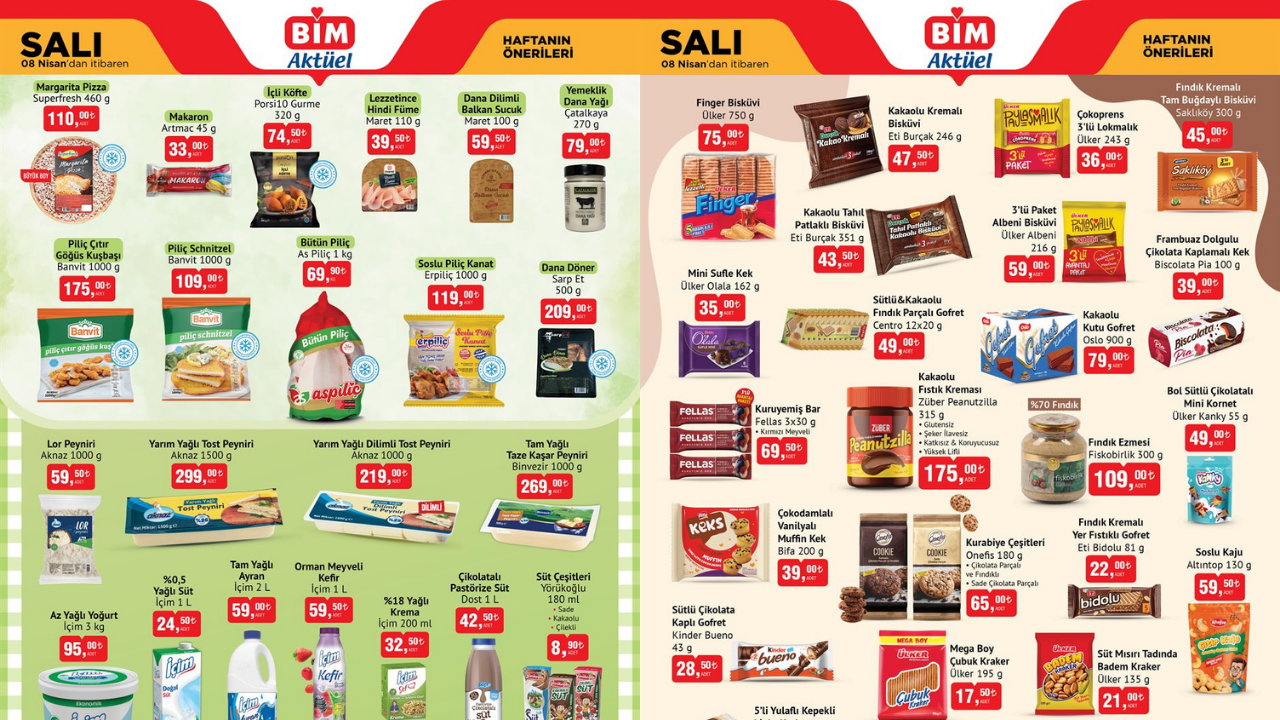 BİM 8 NİSAN 2025 FİYAT LİSTESİSuperfresh Margarita Pizza 460 gr 110 liraArtmac Makaron 45 gr 33 liraPorsi10 Gurme İçli Köfte 320 gr 74,50 liraMaret Lezzetince Hindi Füme 110 gr 39,50 liraMaret Dana Dilimli Balkan Sucuk 100 gr 59,50 liraÇatalkaya Yemeklik Dana Yağı 270 gr 79 liraSarp Et Dana Döner 500 gr 209 liraErpiliç Soslu Piliç Kanat 1000 gr 119 liraAs Piliç Bütün Piliç 1 kg 69,90 liraBanvit Piliç Schnitzel 1000 gr 109 liraBanvit Piliç Çıtır Göğüs Kuşbaşı 1000 gr 175 liraAknaz Lor Peyniri 1000 gr 59,50 liraAknaz Yarım Yağlı Tost Peyniri 1500 gr 299 liraAknaz Yarım Yağlı Dilimli Tost Peyniri 1000 gr 219 liraBinvezir Tam Yağlı Taze Kaşar Peyniri 1000 gr 269 liraYörükoğlu Süt Çeşitleri 180 ml 8,90 liraİçim Az Yağlı Yoğurt 3 kg 95 liraİçim Yüzde 0,5 Yağlı Süt 1 L 24,50 liraİçim Tam Yağlı Ayran 2 L 59 liraİçim Orman Meyveli Kefir 1 L 59,50 liraİçim Yüzde 18 Yağlı Krema 200 ml 32,50 liraDost Çikolatalı Pastörize Süt 1 L 42,50 liraMeram Tereyağı 250 gr 79,50 liraSek Labne 3x180 gr 99,50 liraSek Yarım Yağlı Yoğurt 5 kg 159,50 liraSek Süzme Yoğurt 400 gr 49,50 liraSek Yaban Mersinli Quark 140 gr 29 liraSek Ayran 200 ml 6,50 liraÜlker Finger Bisküvi 750 gr 75 lira