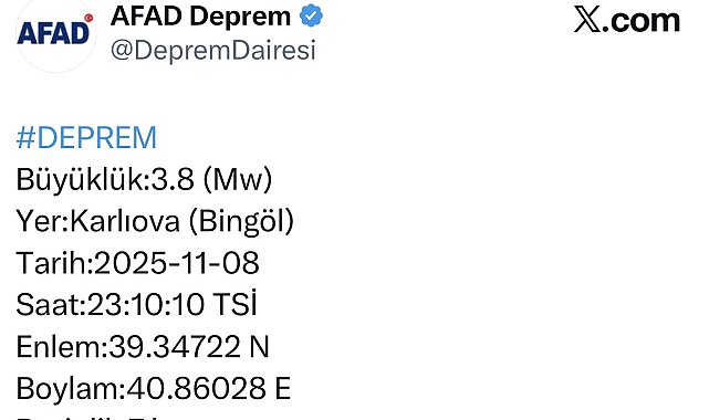 Merkez üssü Bingöl'ün Karlıova ilçesi olan 3.8 büyüklüğünde deprem meydana geldi.Afet ve Acil Durum Yönetimi Başkanlığı Deprem Dairesi Başkanlığından alınan bilgiye göre, saat 23:10'da merkez üssü Bingöl'ün Karlıova ilçesinde 3.8 büyüklüğünde deprem meydana geldi. Yerin yaklaşık 7 kilometre derinliğinde meydana gelen depremle ilgili olumsuz bir durum yaşanmadığı öğrenildi.