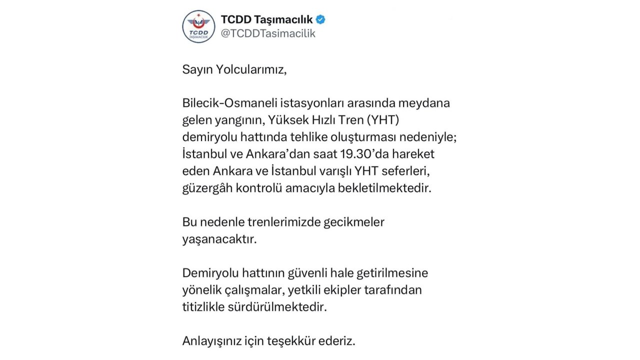 Bilecik'in Osmaneli ilçesinde devam orman yangını, İstanbul-Ankara hızlı tren seferlerini olumsuz etkiledi.TCDD Taşımacılık tarafından yapılan açıklamada, "Bilecik-Osmaneli istasyonları arasında meydana gelen yangının Yüksek Hızlı Tren (YHT) demiryolu hattında tehlike oluşturması nedeniyle İstanbul ve Ankara'dan saat 19.30'da hareket eden Ankara ve İstanbul varışlı YHT seferleri, güzergâh kontrolü amacıyla bekletilmektedir. Bu nedenle trenlerimizde gecikmeler yaşanacaktır. Demiryolu hattının güvenli hale getirilmesine yönelik çalışmalar, yetkili ekipler tarafından titizlikle sürdürülmektedir" denildi.
