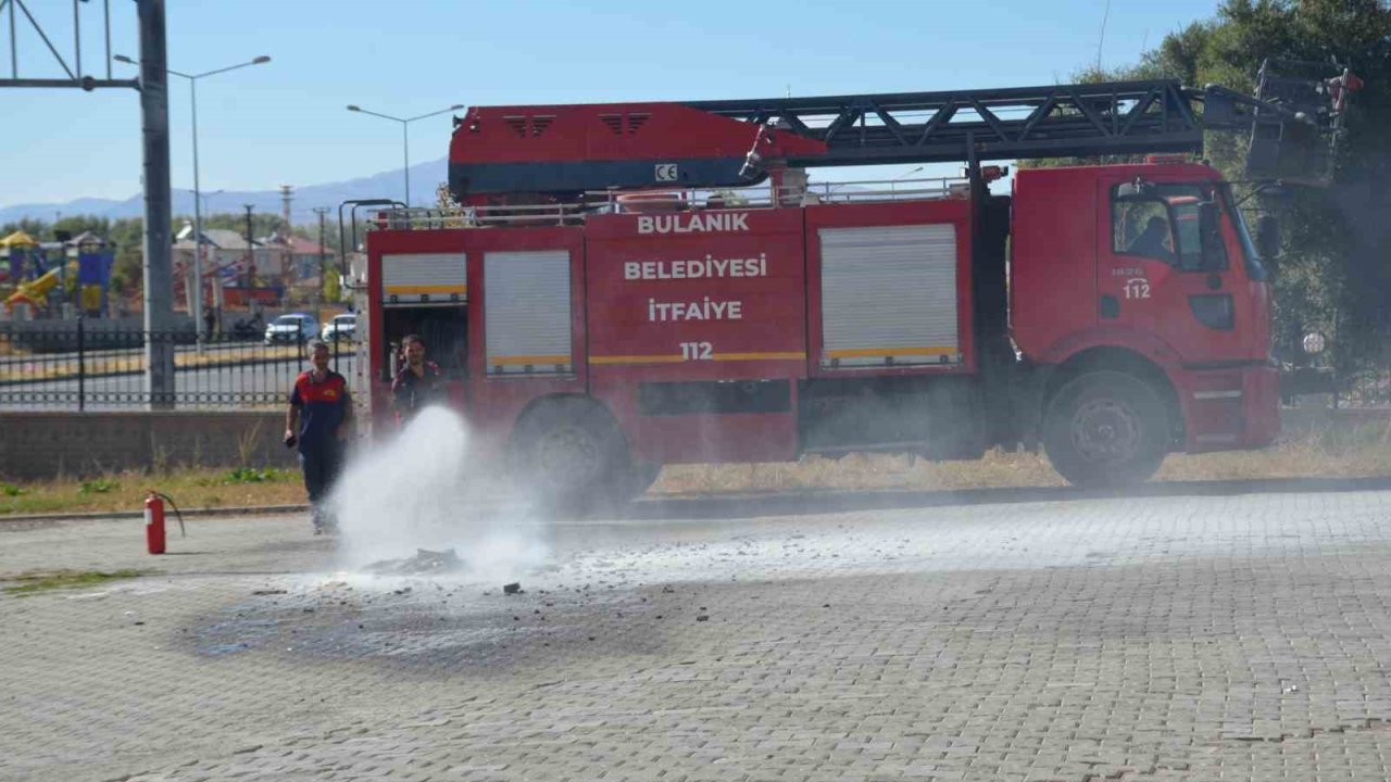 Muş'un Bulanık Kaymakamlığında görevli personele uygulamalı yangın tatbikatı eğitim verildi.Bulanık Kaymakamlığı ve Sosyal Yardımlaşma ve Dayanışma Vakfı (SYDV) binalarında gerçekleştirilen tatbikat öncesinde İç Güvenlik Uzmanı ve Yangın Eğitmeni Nazlı Bilginer tarafından personele yangınların çıkış sebepleri ve alınacak önlemler hakkında bilgi verildi. Eğitimin ardından Bulanık Belediyesi İtfaiye Müdürlüğü ekiplerinin de desteğiyle kurum bahçelerinde yangın söndürme tatbikatı yapıldı. Tatbikatta, benzinle yakılan ateşe yangın tüpleriyle nasıl müdahale edileceği uygulamalı olarak gösterildi.