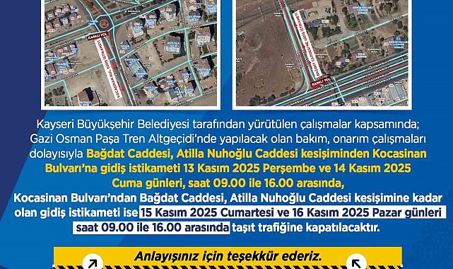 Kayseri Büyükşehir Belediyesi tarafından Gazi Osman Paşa Tren Altgeçidinde yapılacak olan bakım ve onarım çalışmaları nedeniyle sürücülere uyarı yapıldı.Kayseri Büyükşehir Belediyesi tarafından yapılan uyarıda, "Kayseri Büyükşehir Belediyesi tarafından yürütülen çalışmalar kapsamında; Gazi Osman Paşa Tren Altgeçidi'nde yapılacak olan bakım, onarım çalışmaları dolayısıyla Bağdat Caddesi, Atilla Nuhoğlu Caddesi kesişiminden Kocasinan Bulvarı'na gidiş istikameti 13 Kasım 2025 Perşembe ve 14 Kasım 2025 Cuma günleri, saat 09.00 ile 16.00 arasında, Kocasinan Bulvarı'ndan Bağdat Caddesi, Atilla Nuhoğlu Caddesi kesişimine kadar olan gidiş istikameti ise 15 Kasım 2025 Cumartesi ve 16 Kasım 2025 Pazar günleri saat 09.00 ile 16.00 arasında taşıt trafiğine kapatılacaktır" ifadelerine yer verildi.