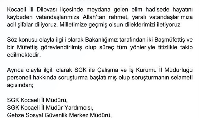 Çalışma ve Sosyal Güvenlik Bakanlığı, Kocaeli'nin Dilovası ilçesinde 6 kişinin hayatını kaybettiği parfüm dolum tesisindeki yangına ilişkin SGK Kocaeli İl Müdürü, SGK Kocaeli İl Müdür Yardımcısı, Gebze Sosyal Güvenlik Merkez Müdürü, Çalışma ve İş Kurumu Kocaeli İl Müdürü, İŞKUR Dilovası Hizmet Merkezi Müdürü, İŞKUR CİMER'den Sorumlu Şube Müdürü ve 1 personelin açığa alındığını açıkladı.Çalışma ve Sosyal Güvenlik Bakanlığı tarafından Kocaeli'nin Dilovası'nda meydana gelen yangınla alakalı açıklama yapıldı. Açıklamada, "Kocaeli ili Dilovası ilçesinde meydana gelen elim hadisede hayatını kaybeden vatandaşlarımıza Allah'tan rahmet, yaralı vatandaşlarımıza acil şifalar diliyoruz. Milletimize geçmiş olsun dileklerimizi iletiyoruz. Söz konusu olayla ilgili olarak Bakanlığımız tarafından iki başmüfettiş ve bir müfettiş görevlendirilmiş olup, süreç tüm yönleriyle titizlikle takip edilmektedir" ifadelerine yer verildi.7 kişinin açığa alındığı belirtilen açıklamada, "Ayrıca olayla ilgili olarak SGK ile Çalışma ve İş Kurumu İl Müdürlüğü personeli hakkında soruşturma başlatılmış olup, soruşturmanın selameti açısından SGK Kocaeli İl Müdürü, SGK Kocaeli İl Müdür Yardımcısı, Gebze Sosyal Güvenlik Merkez Müdürü, Çalışma ve İş Kurumu Kocaeli İl Müdürü, İŞKUR Dilovası Hizmet Merkezi Müdürü, İŞKUR CİMER'den Sorumlu Şube Müdürü ve bir personel açığa alınmıştır. Kamuoyunun doğru bilgilendirilmesi adına sürecin her aşaması dikkatle takip edilmekte ve gerekli tüm adımlar atılmaktadır" denildi.