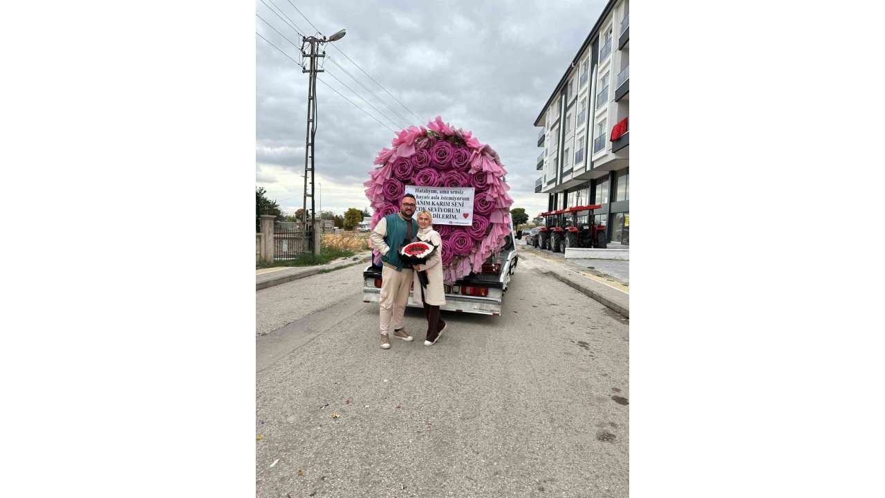 Ankara'nın Akyurt ilçesinde bir vatandaş, eşinden özür dilemek için çekiciyle dev bir çiçek gönderdi.
