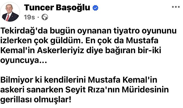 Cumhuriyet Halk Partisi'nden (CHP) istifa eden Hayrabolu Belediye Başkanı Tuncer Başoğlu, dün yapılan CHP Tekirdağ İl Başkanlığı seçimlerinin ardından sosyal medya hesabından dikkat çeken bir paylaşım yaptı.Geçtiğimiz günlerde CHP'den istifa eden Hayrabolu Belediye Başkanı Tuncer Başoğlu, sosyal medya hesabından yaptığı paylaşımda, izlediği bir tiyatro oyununa atıfta bulunarak, "Tekirdağ'da bugün oynanan tiyatro oyununu izlerken çok güldüm. En çok da 'Mustafa Kemal'in askerleriyiz' diye bağıran bir-iki oyuncuya. Bilmiyor ki, kendilerini Mustafa Kemal'in askeri sanarken Seyit Rıza'nın müridesinin gerillası olmuşlar" ifadelerini kullandı.Başkan Başoğlu'nun söz konusu paylaşımı kısa sürede sosyal medyada gündem olurken, siyasi çevrelerde de geniş yankı uyandırdı.