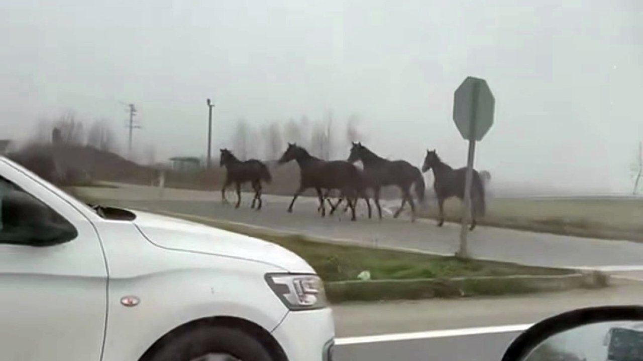 Sakarya'nın Akyazı ilçesi D-140 kara yoluna çıkan atlar dörtnala koştu. Görenleri hayrete düşüren anlar saniye saniye cep telefonu kamerasıyla kaydedildi.