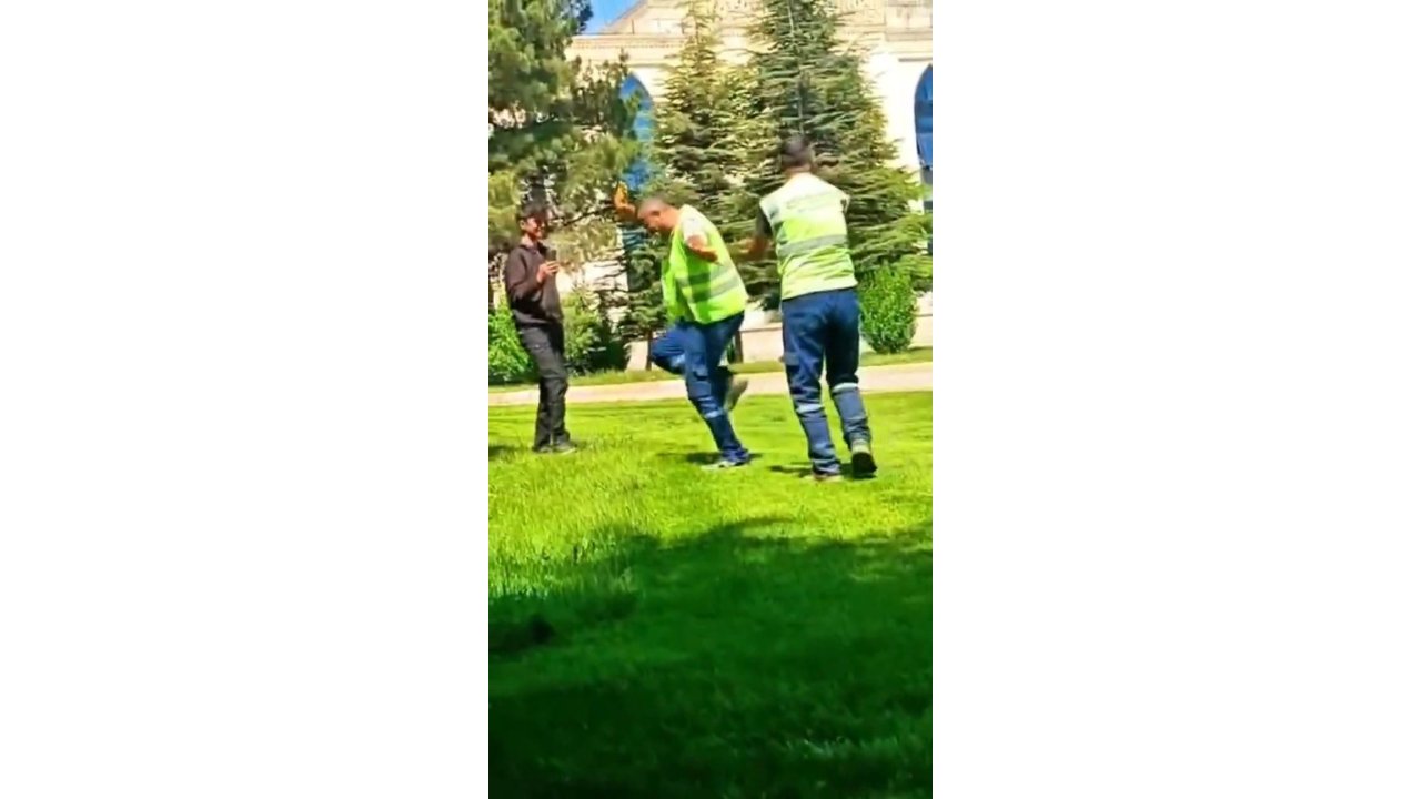 Elazığ'da görevleri başında olan temizlik görevlileri, davulun sesini duymalarıyla oynamaya başladı.