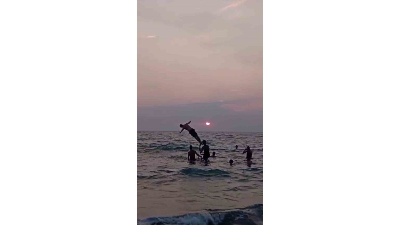 Hatay'da bir grup genç, denizde suyun içine kurdukları merdivenin üzerinden atlayarak doyasıya eğlendi.Arsuz ilçesi Karaağaç sahilinde serinlemek için denize gelen bir grup vatandaş, yanlarında merdiven de getirdi. Denizin ortasına merdiven kuran ve üzerine çıkarak atlayan gençler kameralara yansıdı. Gençlerin neşeli halleri renkli görüntüler oluşturdu.