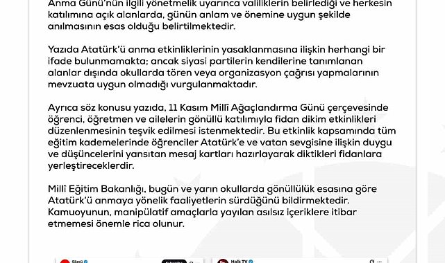 Dezenformasyonla Mücadele Merkezi, Milli Eğitim Bakanlığı'nın (MEB) 10 Kasım'da okullarda Atatürk'ü anmayı yasakladığı ve 'kapıları kilitleyin' talimatı verdiği' iddialarının dezenformasyon içerdiğini belirtti.Dezenformasyonla Mücadele Merkezi, baz mecralarda MEB'in 10 Kasım'da okullarda Atatürk'ü anmayı yasakladığı ve 'kapıları kilitleyin' talimatı verdiği iddiaları üzerine, "İlgili yönetmelik uyarınca valiliklerin belirlediği ve herkesin katılımına açık alanlarda, günün anlam ve önemine uygun şekilde anılmasının esas olduğu belirtilmektedir" açıklamalarında bulundu. Ayrıca, MEB'in 11 Kasım Milli Ağaçlandırma Günü çerçevesinde öğrenci, öğretmen ve ailelerin gönüllü katılımıyla fidan dikim etkinlikleri düzenlenmesinin teşvik edildiği belirtildi.Dezenformasyonla Mücadele Merkezi sosyal medya üzerinden yaptığı yazılı açıklamada şu ifadelere yer verdi:"Çeşitli basın organlarında ve sosyal medya mecralarında, "Milli Eğitim Bakanlığı'nın 10 Kasım'da okullarda Atatürk'ü anmayı yasakladığı ve 'kapıları kilitleyin' talimatı verdiği' şeklinde yer alan iddialar dezenformasyon içermektedir. Milli Eğitim Bakanlığı'nın 8 Kasım tarihli yazısında, 10 Kasım Atatürk'ü Anma Günü'nün ilgili yönetmelik uyarınca valiliklerin belirlediği ve herkesin katılımına açık alanlarda, günün anlam ve önemine uygun şekilde anılmasının esas olduğu belirtilmektedir. Yazıda Atatürk'ü anma etkinliklerinin yasaklanmasına ilişkin herhangi bir ifade bulunmamakta; ancak siyasi partilerin kendilerine tanımlanan alanlar dışında okullarda tören veya organizasyon çağrısı yapmalarının mevzuata uygun olmadığı vurgulanmaktadır. Ayrıca söz konusu yazıda, 11 Kasım Milli Ağaçlandırma Günü çerçevesinde öğrenci, öğretmen ve ailelerin gönüllü katılımıyla fidan dikim etkinlikleri düzenlenmesinin teşvik edilmesi istenmektedir. Bu etkinlik kapsamında tüm eğitim kademelerinde öğrenciler Atatürk'e ve vatan sevgisine ilişkin duygu ve düşüncelerini yansıtan mesaj kartları hazırlayarak diktikleri fidanlara yerleştireceklerdir. Milli Eğitim Bakanlığı, bugün ve yarın okullarda gönüllülük esasına göre Atatürk'ü anmaya yönelik faaliyetlerin sürdüğünü bildirmektedir. Kamuoyunun, manipülatif amaçlarla yayılan asılsız içeriklere itibar etmemesi önemle rica olunur."