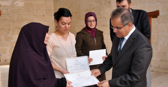 Kursiyerlerin işaret diliyle seslendirdikleri “emrin olur” isimli parça katılımcılar tarafından ilgiyle dinlenirken yine işaret diliyle kursiyerler tarafından Fatiha suresinin meali okunması ve dua edilmesinden sonra 2 Kasım 2016 tarihinden bu yana devam ederek eğitimlerini başarıyla bitiren ve belge almaya hak kazanan 22 kursiyere, Vali Süleyman Tapsız ve eşi Dr. Ayşe Tapsız ile ilgili kurum müdürleri tarafından sertifikaları verildi.