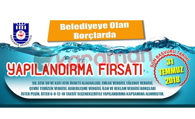 Karaman Belediyesi, 7143 Sayılı torba yasa kapsamında vatandaşların belediyeye olan borçlarını yeniden yapılandırıyor. Bu fırsattan yararlanmak isteyenlerin, 31 Temmuz 2018 tarihine kadar belediyeye müracaat etmeleri gerekiyor.