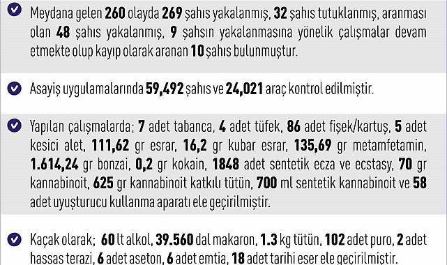 Elazığ'da son bir haftada meydana gelen 260 asayiş olayında, 269 şüpheli yakalanırken 32 şahıs tutuklandı.Elazığ Valiliği, 26 Ekim-2 Kasım 2025 tarihleri arasındaki haftalık asayiş verilerini açıkladı. Cumhuriyet Başsavcılığı koordinesinde güvenlik güçleri tarafından yapılan çalışmalarda kentte, 260 olayın meydana geldiği bildirildi. Bu olaylarda 269 şahıs yakalanırken, 32 kişi tutuklandı, aranması olan 48 kişi de gözaltına alındı. Ayrıca 9 şahsın yakalanmasına yönelik çalışmaların sürdüğü, 10 kayıp şahsın ise bulunduğu aktarıldı. Asayiş uygulamalarında 59 bin 492 şahıs ve 24 bin 21 araç kontrol edildi. Yapılan operasyonlarda 7 tabanca, 4 tüfek, 86 fişek, çok sayıda kesici alet, 1,6 kilogram bonzai, 135 gram metamfetamin, bin 848 sentetik hap ve 700 mililitre sentetik kannabinoid ele geçirildi.Kaçakçılıkla mücadele kapsamında ise 60 litre alkol, 39 bin 560 dal makaron, 1,3 kilogram tütün, 102 puro, 18 tarihi eser ve çeşitli malzemeler bulundu. Kent genelinde meydana gelen 31 trafik kazasında 53 kişi yaralanırken, denetimlerde 10 bin 10 araçtan 2 bin 692'sine cezai işlem uygulandı ve 232 araç trafikten men edildi.