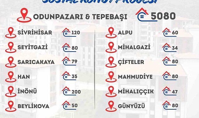 AK Parti Eskişehir Milletvekili Nebi Hatipoğlu sosyal medya üzerinden yaptığı paylaşımda 'Eskişehir Sosyal Konut Projesi'nin başvurularının başladığını açıkladı.Proje kapsamında, Odunpazarı ve Tepebaşı ilçelerinde 5 bin 80, İnönü'nde 200, Sivrihsar'da 120 Seyitgazi, Çifteler, Mahmudiye ve Günyüzü ilçelerinde 80, Sarıcakaya'da 79, Alpu'da 60, Beylikova'da 50, Mihallıçık'ta 47, Han'da 35 ve Mihalgazi içlesinde 34 konut inşa edilecek. AK Parti Eskişehir Milletvekili Nebi Hatipoğlu yaptığı paylaşımda, "Eskişehir'imizin her köşesinde yeni yuvalar yükseliyor, umutlar büyüyor. Sosyal konut projesiyle vatandaşlarımızın sıcak bir yuvaya kavuşması için güçlü bir adım daha atıyoruz. Bu şehir, hizmetin en güzelini hak ediyor. Biz de her ilçemize dokunan, her haneye huzur getiren projelerle çalışmaya devam ediyoruz. Emeği geçen herkese gönülden teşekkür ediyor, Eskişehir'imize hayırlı olmasını diliyorum" ifadelerine yer verdi.