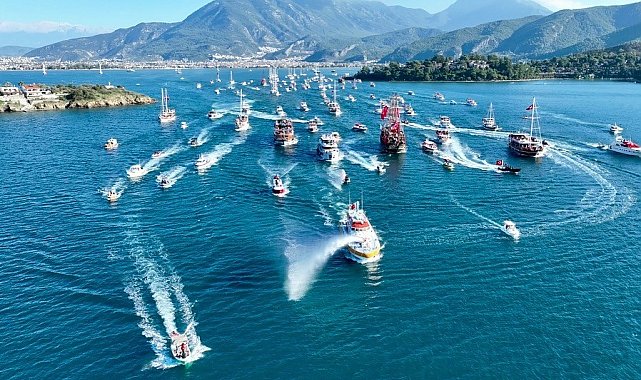 Cumhuriyet'in ilanının 102. yılı kutlamaları kapsamında Fethiye Körfezi'nde deniz alayı ve karada araç konvoyu düzenlendi. Bayraklarla süslenen tekneler, traktörler, otomobiller ve motosikletler, marşlar eşliğinde korteje katıldı.