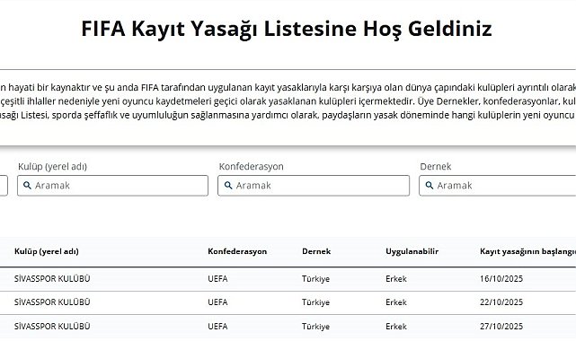 FIFA, Trendyol 1. Lig ekiplerinden Özbelsan Sivasspor'a 3 dönem transfer yasağı getirildiğini açıkladı.