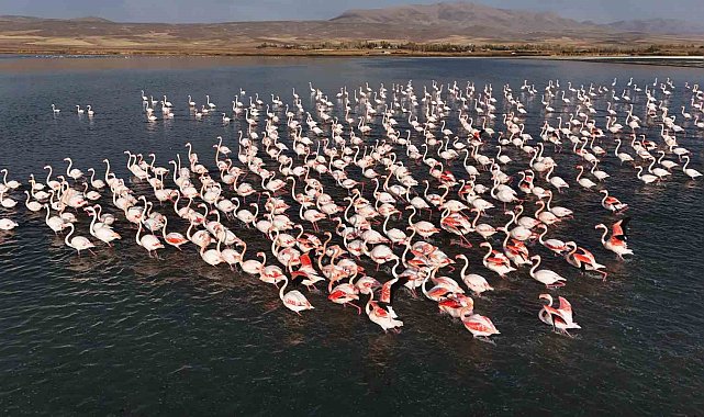 Doğunun saklı cenneti Van'daki Erçek Gölü, zarif misafirleri olan flamingoları ağırlamaya devam ediyor.Göçmen kuşların Kuzey Afrika'dan İran'a uzanan yolculuğunda en önemli konaklama merkezlerinden Van Gölü havzası, sulak alanlarıyla çok sayıda türden binlerce kuşu bünyesinde barındırıyor. Van'ın doğusunda yer alan, eşsiz doğal güzelliği ve biyolojik çeşitliliğiyle dikkat çeken Erçek Gölü, her yıl olduğu gibi bu yıl da flamingoların göç yolculuğunda uğrak noktası oldu. Pembe tüyleri, uzun zarif boyunları ve estetik duruşlarıyla doğa tutkunlarının gözdesi olan flamingolar, hava sıcaklığının mevsim normallerinin üzerinde seyrettiği bölgede konaklama sürelerini uzattı. Başta İran'ın Urumiye Gölü olmak üzere birçok gölün kuruması sonrası Van Gölü kıyıları ve Erçek Gölü'nde konaklayan flamingolar bölge ekosistemine canlılık katmaya devam ediyor. Suya düşen nazlı gölgeleri ve sakin danslarıyla Erçek Gölü'nde görsel şölen oluşturan flamingolar havadan dronla görüntülendi.Van Gölü havzasının sulak alan yönünden zengin olması ve bazı mevsimlerde de küresel ısınmaya bağlı olarak bazı sulak alanlarda çekilmeye bağlı olarak yeni alanlar oluşmaya başladığını belirten Van Yüzüncü Yıl Üniversitesi (Van YYÜ) Yaban Hayvanları Koruma ve Rehabilitasyon Merkezi Müdürü Prof. Dr. Lokman Aslan, "Bu sıcaklık da bazen bazı hayvanlara pozitif yönde yansıdı. Eskiden kış mevsiminin çok sert geçmesine bağlı olarak bazen Nisan'da ve Mayıs'ta görmeye alıştığımız allı turnaları bu sene Şubatta, Martta görmeye başladık. Meteoroloji uzmanı olan iklimi daha önceden sezen ve bilen allı turnalar burada önümüzdeki bir kaç gün içerisinde herhangi bir don ve onları etkileyecek bir problem olmadığından dolayı Aralık ayının başına kadar yoğun şekilde göreceğiz. Geçen senede her yıl sayısı artarak burada konaklayan, kışı burada geçiren allı turnaları görüyorduk. Bu sene daha fazla allı turnaları görme imkanımız olacak" dedi.Van Gölü'ndeki sulak alanlar büyük olduğunu, tamamen kuruma riskiyle karşı karşıya olmadığını ifade eden Prof. Dr. Aslan, "Yaban hayvanların bu havzada beslenebileceği alanlar var. Ve bunları da koruma tedbirleri de alındığından dolayı av yasağının olması, Doğa Koruma ve Milli Parklar 14. Bölge Müdürlüğü ekiplerinin koruma tedbirleri devam ediyor. yaban hayvanları ise gıda ve güvenlik olduğu yere gelirler. Burada sonbahardaki yağışlarla beraber sulak alanlarımızda da artık canlanma meydana geldi. Sulak alanların çevrede eğer gideceği yerde sulak alanlar kuruduysa mesela buna örnek olarak Urumiye Gölü tamamen kurudu. Urumiye Gölü'ne giden ve burada üreyen yaban kuşları, artık buraya gelecekler. Bu da Van Gölü havzası için sulak alanları için bir şans" diye konuştu.