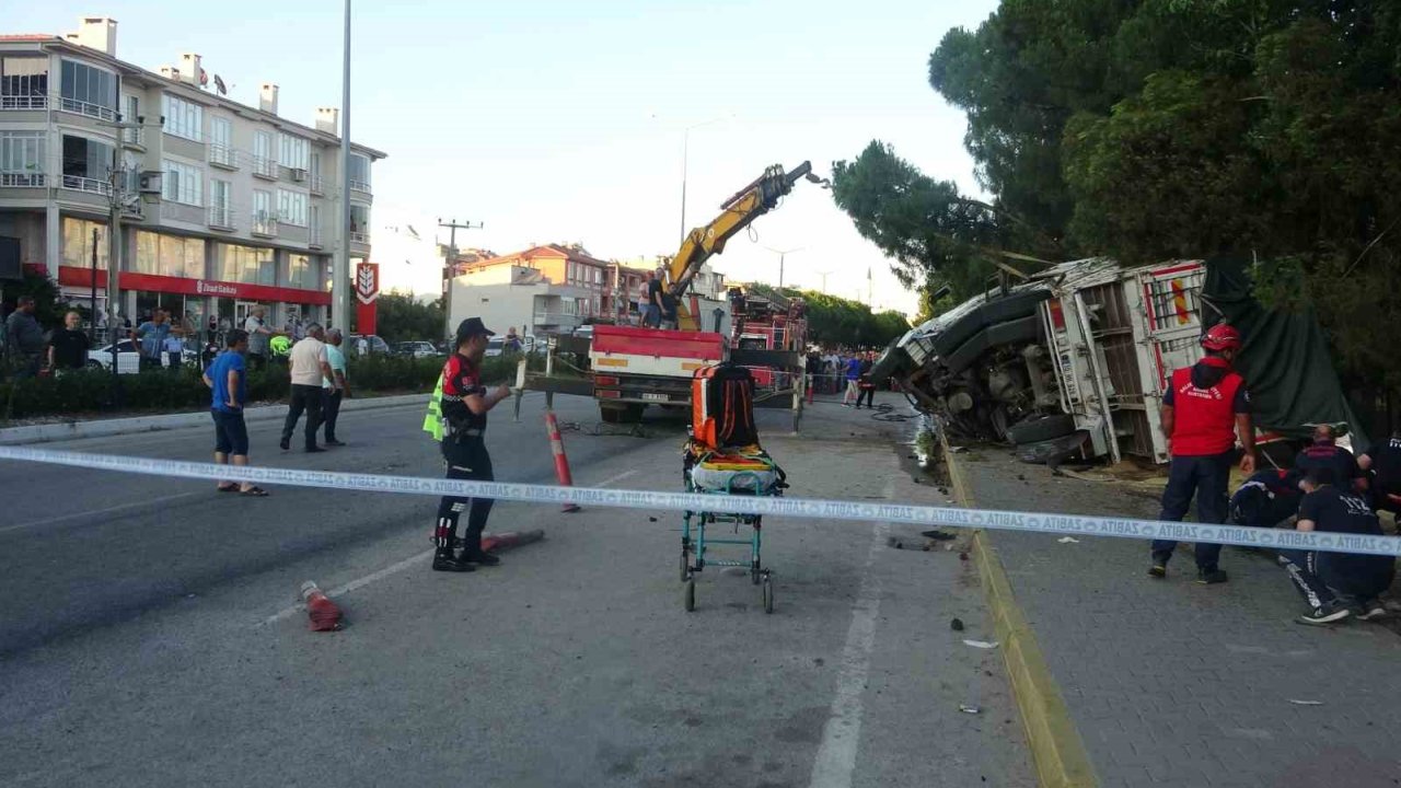 Çanakkale'nin Ayvacık ilçesine bağlı Küçükkuyu beldesinde seyir halindeyken freni patlayan kamyon trafik ışıklarında bekleyen 4 araca çarptı.