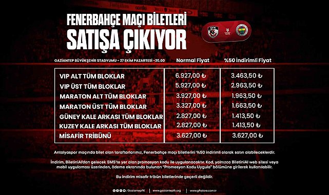 Gaziantep Futbol Kulübü'nün, Süper Lig'in 10. haftasında sahasında Fenerbahçe ile oynayacağı maçın biletleri bugün satışa çıkacak.Gaziantep Futbol Kulübü, Trendyol Süper Lig'in 10. haftasında 27 Ekim Pazartesi günü saat 20.00'da Fenerbahçe'yi konuk edecek. Bu mücadelenin biletleri bugün 14.00 itibariyle satışa çıkacak. Gaziantep Büyükşehir Stadyumu'nda oynanacak zorlu karşılaşmanın bilet fiyatları ev sahibi takım için 2 bin 827 TL ile 6 bin 927 TL arasında belirlenirken, misafir tribün bilet fiyatları ise 3 bin 627 TL oldu.Son iç saha maçına bilet alan ev sahibi taraftarlarına yüzde 50 indirimLigde Antalyaspor ile oynanan son iç saha maçını statta takip eden ev sahibi takım taraftarlarının biletleri, telefonlarına SMS ile gönderilecek olan promosyon kodu ile yüzde 50 indirimli alabileceği açıklandı.Bilet fiyatları Galatasaray maçı ile aynıÖte yandan Fenerbahçe maçı için belirlenen bilet fiyatlarının ligin ilk haftasında oynanan Galatasaray mücadelesinin bilet fiyatları ile aynı olduğu belirtildi.