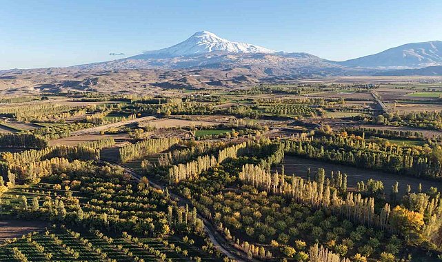 Ağrı Dağı'nın kuzey eteklerinde, Iğdır'ın Melekli beldesinde yer alan İrem Bağları, sonbaharın gelişiyle birlikte adeta renklerin dans ettiği bir tabloya dönüştü.
