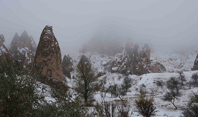 UNESCO Doğal ve Kültürel miras listesinde yer alan ve Türkiye'nin önemli turizm destinasyonları arasında yer alan Kapadokya'da, mevsimin ilk karı yağdı. Kapadokya'da, mevsimin ilk karı peribacalarıyla kaplı vadilerde masalsı manzara oluşturdu. Nevşehir ve çevresinde sabaha karşı başlayan kar yağışıyla bölge kısa sürede beyaz örtüyle kaplandı.Bölgeyi ziyaret eden yerli ve yabancı turistler, karla kaplanan peribacaları ve doğal kaya oluşumları arasında gezinti yapıp bol bol fotoğraf çekti.Kocaeli'nden gelen Remziye Efendi, "Geçtiğimiz yılda mevsimin ilk kar yağışında Kapadokya'ya gelmiştim. Bu ikinci gelişim. Bu gün yine karlı bir Kapadokya'ya uyandık. Karlı Kapadokya harika bir görüntüye sahip. Bu da her zaman nasip olmuyor. Peri bacaları da adeta gelinlik giymiş gibi görünüyor.Endonezya'dan ilk defa Kapadokya'ya geldiğini söyleyen Abay Farız Mahardıka'da yaptığı açıklamada, "Kapadokya'ya ilk defa geliyorum. Bu gün muhteşem kar yağışı var. Bu nedenle çok mutlu oldum. Kapadokya'nın bu hali fotoğraf çekinmek için çok güzel. Umarım bir kez daha Kapadokya'ya gelebilirim" ifadelerini kullandı.Olumsuz hava şartları nedeniyle sıcak hava balon turlarının iki gündür gerçekleştirilemediği bölgede, meteoroloji verilerine göre kar yağışının akşam saatlerine kadar aralıklarla sürmesi bekleniyor.