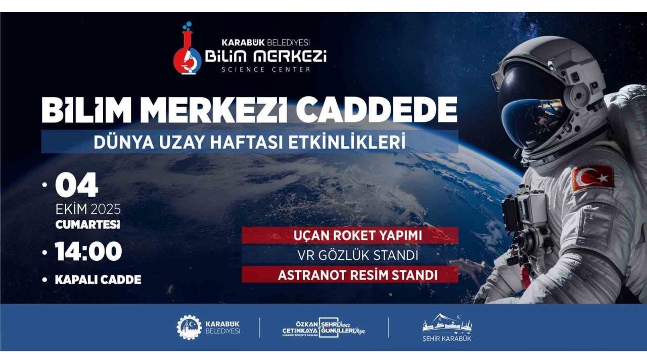 Karabük Belediyesi Bilim Merkezi, 4-10 Ekim tarihleri arasında kutlanan Dünya Uzay Haftası dolayısıyla özel bir etkinlik programı düzenliyor.Etkinlik, 4 Ekim Cumartesi günü saat 14.00'te Kemal Güneş Caddesi'nde (Kapalı Cadde) gerçekleştirilecek. Her yaştan katılımcıya açık olacak program kapsamında uçan roket yapımı atölyesi, sanal gerçeklik (VR) gözlük standı ve astronot temalı resim standı gibi uygulamalı etkinlikler yer alacak.Karabük Belediye Başkanı Özkan Çetinkaya, etkinliğe ilişkin yaptığı açıklamada, programın hem eğlenceli hem de eğitici yönüyle dikkat çektiğini belirtti.Çetinkaya, "Bilim ve teknoloji, çağımızın en önemli dinamikleri arasında yer almaktadır. Çocuklarımızın ve gençlerimizin bilimsel meraklarını canlı tutmak, onları geleceğin bilim insanları ve teknoloji liderleri olmaya teşvik etmek bizler için büyük önem arz etmektedir. Bu çerçevede Dünya Uzay Haftası kapsamında Karabük'te gerçekleştireceğimiz etkinliklerle hem şehrimizde bilim kültürünü yaygınlaştırmayı hem de gençlerimize ilham vermeyi amaçlıyoruz" ifadelerini kullandı.