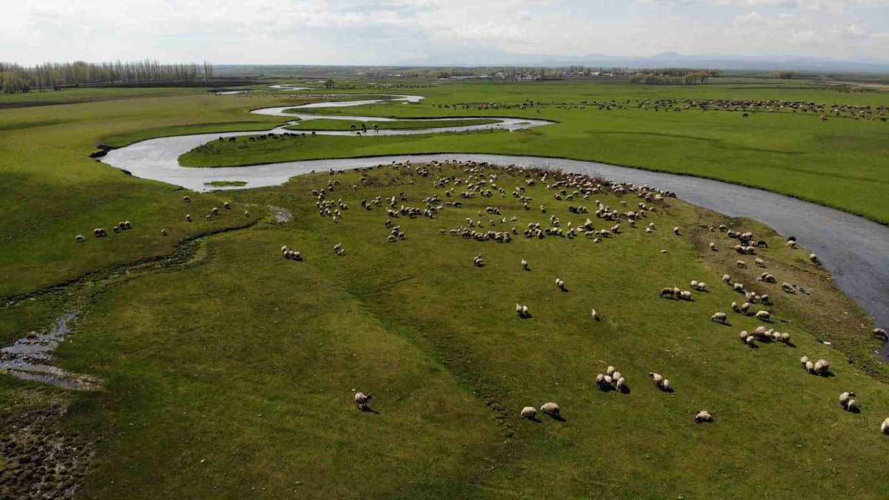 Kars'ta meralarda büyükbaş ve küçükbaş hayvan sesleri yükseliyor. Uzun ve zorlu geçen kışın ardından hayvan yetiştiricileri hayvanlarını meralarda otlatmaya başladı.Türkiye'nin en önemli hayvancılık şehirlerinden birisi olan Kars'ta meralar renklendi. Kuzu ve koyun seslerinin yankılandığı uçsuz bucaksız meralar havadan görüntülendi.Güneşin yüzünü göstermesiyle birlikte hayvanlarını meralara çıkardıklarını ifade eden hayvan yetiştiricisi Sezer Kurtbaş, "Beklediğimiz bahar geç geldi, her şeye rağmen yine hayvanlarımızı çıkardık. Ekinlerimizi de ektik. Güzel bir verim olmasını diliyorum" dedi.Öte yandan, bahar ayın ile birlikte yeşeren meralara yayılan hayvanlar, kameralara yansıdı. Büyük ve küçükbaş hayvan sürülerini yeşeren meralara çıkararak otlatmaya başladı. Arpaçay çayının etrafında yayılan hayvanlar renkli görüntüler ortaya çıkardı.