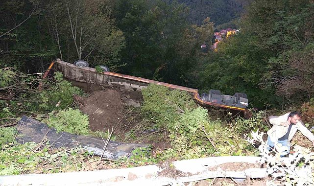 Kastamonu'nun Bozkurt ilçesinde iş makinesi yüklü tırın şarampole devrildiği kazada sürücü yaralandı.
