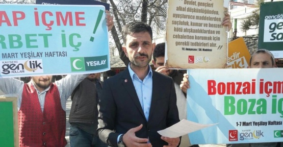 Kayseri Saadet Partisi Gençlik Kolları Yeşilay Haftası nedeniyle kötü alışkanlıklara dikkat çekerek, ’Şarap içme şerbet iç’ sloganı ile vatandaşlara şerbet ve boza dağıttı.Kayseri Saadet Partisi Gençlik Kolları 1-7 Mart Yeşilay Haftasına dikkat çekmek için, “Şarap içme şerbet iç” ve “Bonzai içme boza iç” sloganlarıyla şerbet ve boza dağıttı. Şerbet ve boza dağıtımından sonra açıklama yapan Başkan Samet Yücel, ”Sigara üretiminde dünyada 7. sırada olan ülkemiz, 2.72 milyar dolar ekonomik kayba uğramakta ve 110 bin insanını zamansız ve erken toprağa vermektedir. Alkol konusunda ise; eğitim sürecinde stresli olan ve aşırı sorumluluk yüklenen gençlerin eğitimli olmalarının aksine eğitimsiz gençlere göre daha çok alkole eğilim gösterdikleri araştırmalar sonucu anlaşılmaktadır.” ifadelerine yer verdi.Hükümetin uyuşturucu, sigara ve alkol tüketiminde yeterli çalışmalarda bulunmadığına değinen Başkan Yücel, ” Devletin uyuşturucu maddeler konusundaki görevi gençliği sonuçlardan koruyarak izole etmek değil; üretimi, ticareti, sevkıyatı, dış destekleri gibi sebeplerin ve kaynakların kendisiyle mücadele ederek toplumun tümünü ilgilendiren bu illetten kurtarmaktır.” dedi.