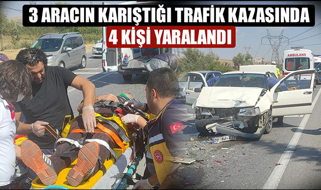 Konya'nın Seydişehir ilçesinde 3 aracın karıştığı trafik kazasında 4 kişi yaralandı. Şahin Şimşek idaresindeki 70 AJ 837 plakalı otomobil, Seydişehir-Konya yolu Karabulak Kavşağı'nda aynı yönde seyir halindeki Necmi Bolluk idaresindeki 07 AHJ 868 plakalı otomobille çarpıştı.Bolluk'un kullandığı otomobil çarpışmanın etkisiyle kırmızı ışıkta bekleyen Efsan Sadıkoğlu idaresindeki 06 CDC 164 plakalı otomobile çarptı.Kazada, sürücü Şimşek ve 07 AHJ 868 plakalı otomobilde bulunan Hatice Ceren, Mehmet Muhammet ve Nazife Bolluk yaralandı.Yaralılar, olay yerine sevk edilen ambulanslarla Seydişehir Devlet hastanesine kaldırıldı.