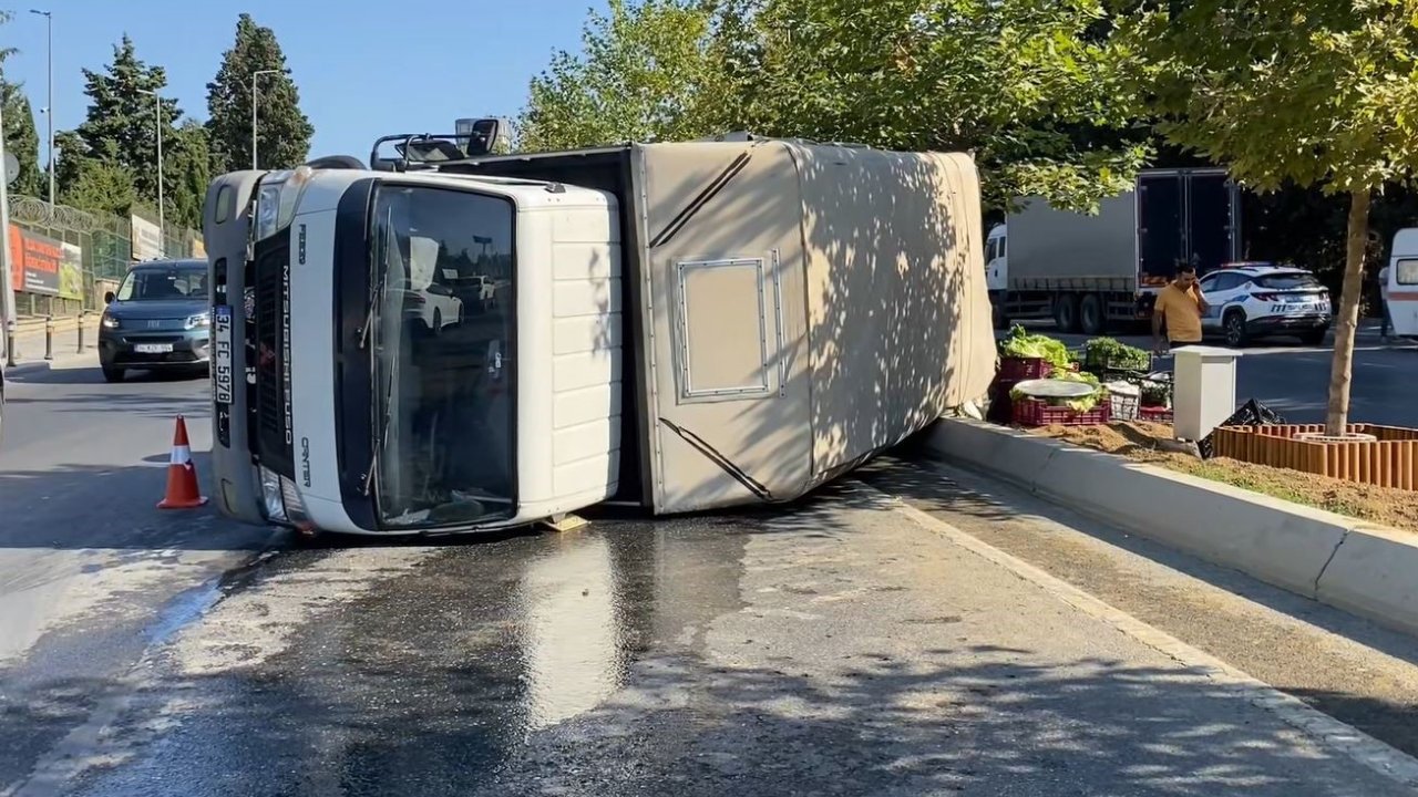 İstanbul Küçükçekmece'de sürücüsünün kontrolünü kaybettiği sebze yüklü kamyonet devrildi.