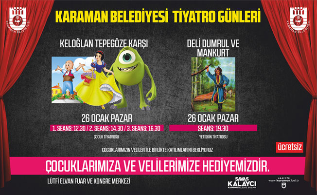 Gerçekleştirdiği birçok projelerinde, geleceğin teminatı çocuklara ayrı bir yer veren Karaman Belediyesi, çocukların sosyal ve kültürel anlamdaki gelişimlerini sağlamak amacıyla birbirinden güzel etkinliklere imza atmaya devam ediyor. Okulların tatile girmesiyle çocuklar için eğlenceli bir oyundan oluşan tiyatro gösterisi tertip eden Karaman Belediyesi, yetişkinleri de unutmadı. 26 Ocak 2020 Pazar günü düzenlenen iki farklı tiyatroda çocuklar için “Keloğlan Tepegöze Karşı” oyunu, yetişkinler için de “Deli Dumrul ve Mankurt” oyunu sahnelenecek.