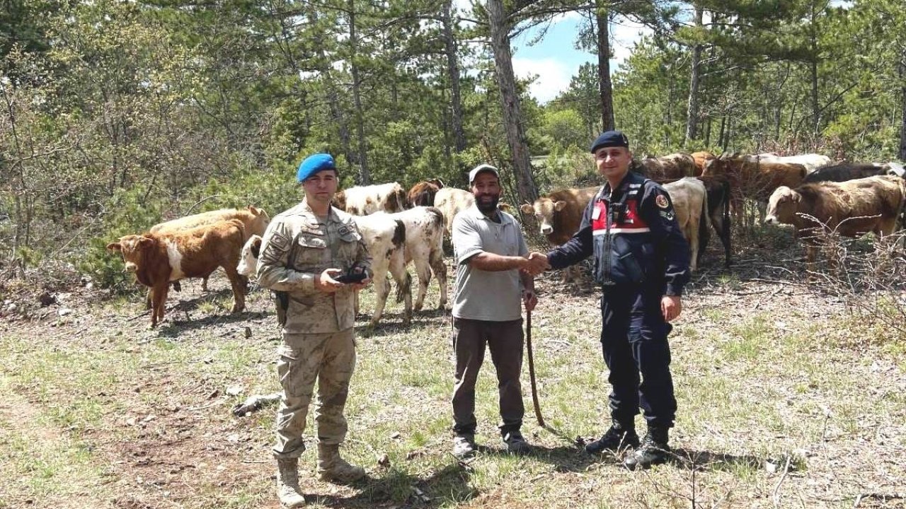 Kütahya'nın Soğukçeşme köyü ormanlık alanında 3 gün önce kaybolan 19 büyükbaş hayvan jandarma ekiplerince bölgeye yaklaşık 5 kilometre uzaklıkta dron ile bulunarak sahibine teslim edildi.