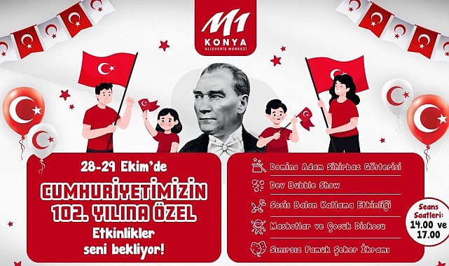 IHAAW114218-KLT/27-10-2025 - M1 Konya AVM'DE Cumhuriyet'in 102'nci yılı coşkuyla kutlanıyor (Fotoğraflı) KONYA (İHA) - Konya'nın önde gelen alışveriş ve yaşam merkezlerinden M1 Konya Alışveriş Merkezi, Cumhuriyetin 102'nci yılını coşkuyla kutlamaya hazırlanıyor. Fiba Commercial Properties tarafından yönetilen M1 Konya AVM, 28-29 Ekim tarihlerinde iki gün boyunca sürecek dolu ve renkli bir etkinlik programıyla ziyaretçilerini ağırlayacak. Cumhuriyet Bayramı'nın coşkusunu aileler ve çocuklarla bir arada yaşatmak amacıyla hazırlanan program kapsamında; ödüllü illüzyonist Domino Adam'ın büyüleyici performansı, Renkli Dev Bubble Show, Eğlenceli Sosis Balon Atölyesi, sevimli maskot karakterler ve neşeli çocuk dans gösterileri yer alacak. Tüm bu etkinliklerin yanı sıra, etkinliğe katılan AVM ziyaretçilerine ücretsiz pamuk şeker ikramı yapılacak. Etkinlikler, 28-29 Ekim tarihlerinde gün boyunca 4 ayrı seansta gerçekleştirilecek. M1 Konya AVM, bu özel organizasyonla Cumhuriyet Bayramı'nın milli ruhunu yaşatırken, ailelere unutulmaz anlar sunacak.(İHA-E)27.10.2025 11:56:38 TSINNNN