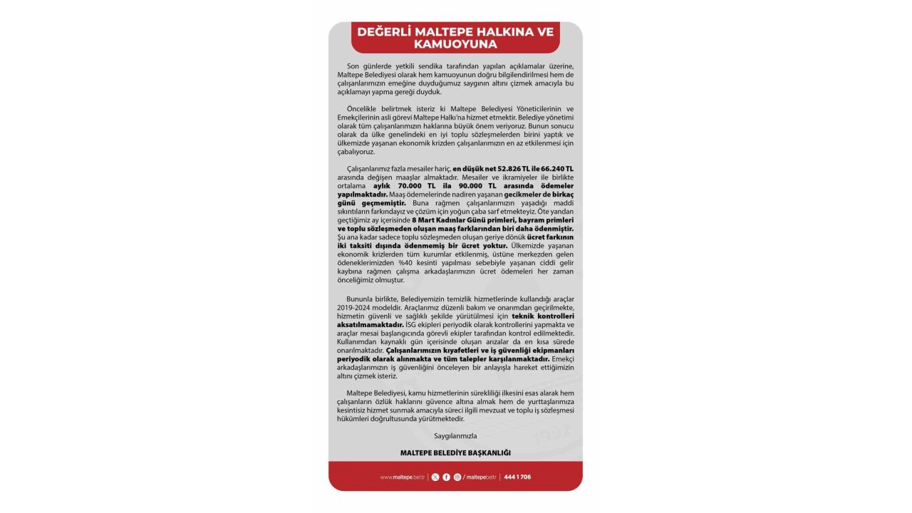 Maltepe Belediyesi, yetkili sendikanın işçi alacaklarının ödenmediği iddiasıyla süresiz iş bırakacağına dair yapılan haberler üzerine açıklama yaptı. Açıklamada, belediye olarak ülke genelinde en iyi toplu sözleşmelerden birini yaptıklarının altını çizen Maltepe Belediyesi, yaşanan ekonomik krizden çalışanların en az etkilenmesi için çabaladıklarını belirtti.Maltepe Belediyesi, son günlerde yetkili sendika tarafından yapılan açıklamalar üzerine hem kamuoyunun doğru bilgilendirilmesi hem de çalışanların emeğine duydukları saygının altını çizmek amacıyla "Değerli Maltepe Halkına ve Kamuoyuna" başlıklı açıklama yaptı.Açıklamada, "Çalışanlarımız fazla mesailer hariç, en düşük net 52.826 TL ile 66.240 TL arasında değişen maaşlar almaktadır. Mesailer ve ikramiyeler ile birlikte ortalama aylık 70.000 TL ila 90.000 TL arasında ödemeler yapılmaktadır. Maaş ödemelerinde nadiren yaşanan gecikmeler de birkaç günü geçmemiştir. Buna rağmen çalışanlarımızın yaşadığı maddi sıkıntıların farkındayız ve çözüm için yoğun çaba sarf etmekteyiz. Öte yandan geçtiğimiz ay içerisinde 8 Mart Kadınlar Günü primleri, bayram primleri ve toplu sözleşmeden oluşan maaş farklarından biri daha ödenmiştir. Şu ana kadar sadece toplu sözleşmeden oluşan geriye dönük ücret farkının iki taksiti dışında ödenmemiş bir ücret yoktur. Ülkemizde yaşanan ekonomik krizlerden tüm kurumlar etkilenmiş, üstüne merkezden gelen ödeneklerimizden yüzde 40 kesinti yapılması sebebiyle yaşanan ciddi gelir kaybına rağmen çalışma arkadaşlarımızın ücret ödemeleri her zaman önceliğimiz olmuştur." denildi.Maltepe Belediye Başkanlığı'nın açıklamasında iş sağlığı ve güvenliği konularına da yer verildi. Belediyenin temizlik hizmetlerinde kullanılan araçların 2019-2024 modeli olduğunun altının çizildiği açıklamada şu ifadelere yer verildi: "Araçlarımız düzenli bakım ve onarımdan geçirilmekte, hizmetin güvenli ve sağlıklı şekilde yürütülmesi için teknik kontrolleri aksatılmamaktadır. İSG ekipleri periyodik olarak kontrollerini yapmakta ve araçlar mesai başlangıcında görevli ekipler tarafından kontrol edilmektedir. Kullanımdan kaynaklı gün içerisinde oluşan arızalar da en kısa sürede onarılmaktadır. Çalışanlarımızın kıyafetleri ve iş güvenliği ekipmanları periyodik olarak alınmakta ve tüm talepler karşılanmaktadır. Emekçi arkadaşlarımızın iş güvenliğini önceleyen bir anlayışla hareket ettiğimizin altını çizmek isteriz. Maltepe Belediyesi, kamu hizmetlerinin sürekliliği ilkesini esas alarak hem çalışanların özlük haklarını güvence altına almak hem de yurttaşlarımıza kesintisiz hizmet sunmak amacıyla süreci ilgili mevzuat ve toplu iş sözleşmesi hükümleri doğrultusunda yürütmektedir."