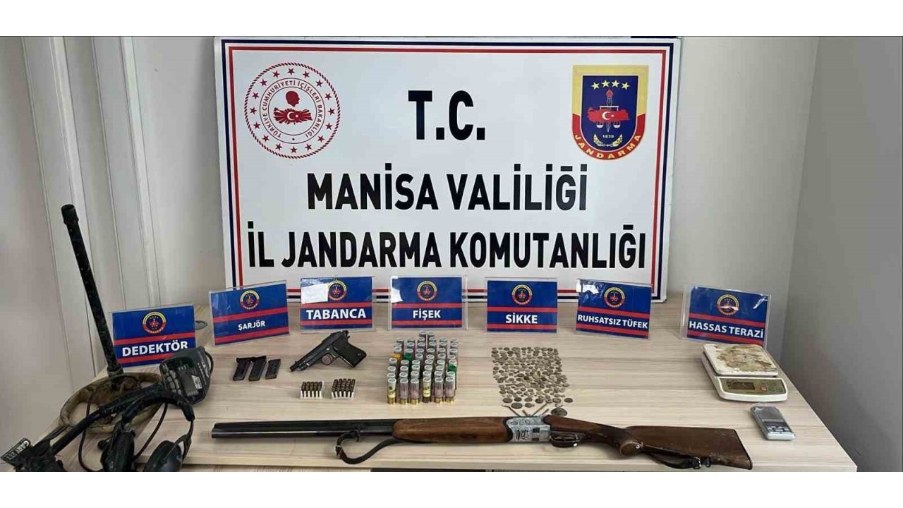 Manisa'nın Salihli ilçesinde jandarma ekiplerince düzenlenen operasyonda çok sayıda tarihi eser, ruhsatsız silah ve dedektör ele geçirildi.