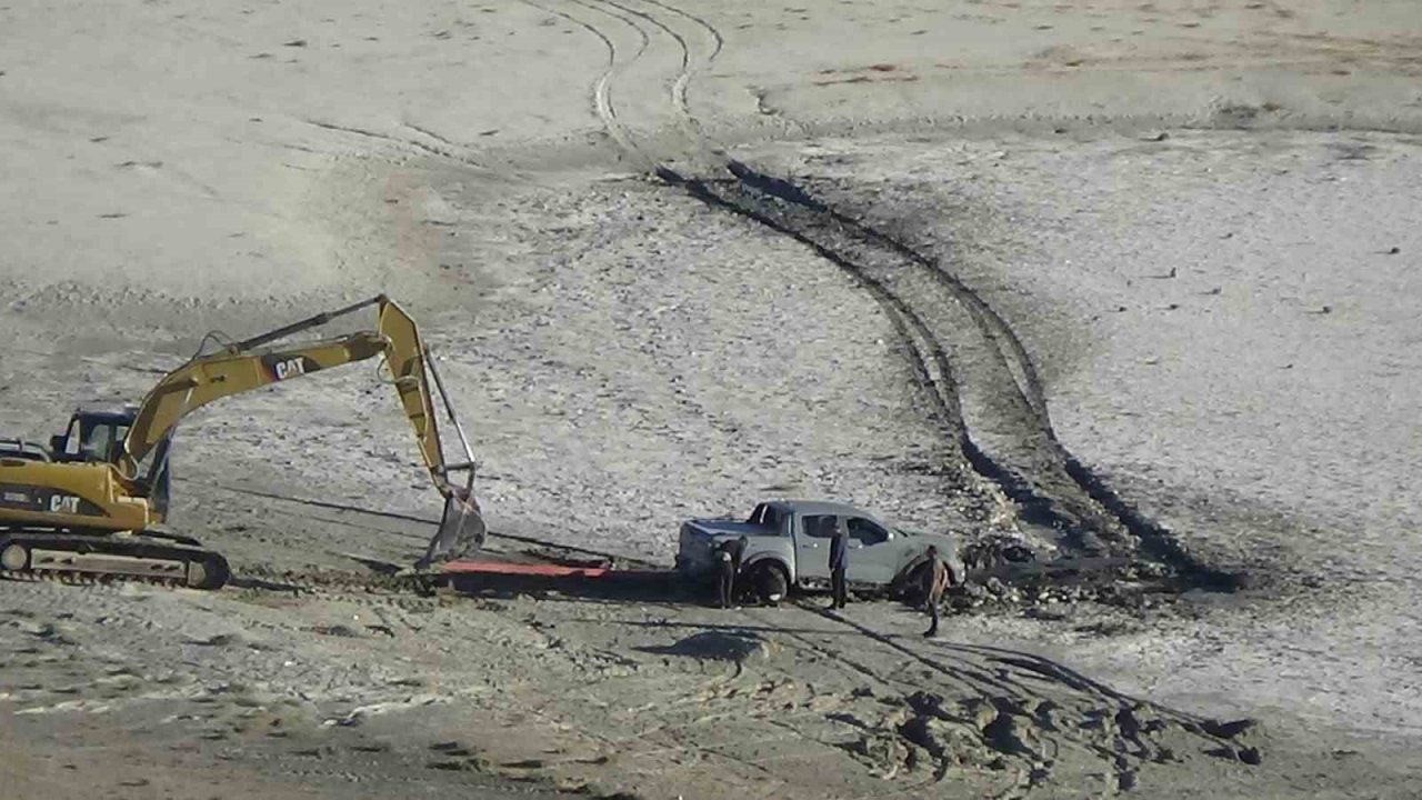 Konya'nın Karapınar ilçesinde 1. derece sit alanındaki Meke Gölü'nde bataklığa saplanan gurbetçi ailenin aracı iş makinesi yardımıyla kurtarıldı.